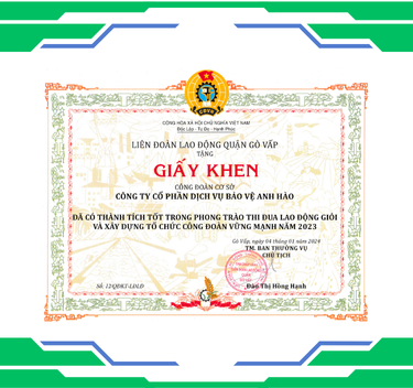 Vừa qua, Công Ty Cổ Phần Dịch Vụ Bảo Vệ Anh Hào đã vinh dự đón nhận Giấy khen từ Liên đoàn Lao động Quận nhờ những đóng góp nổi bật trong lĩnh vực bảo vệ và chăm lo đời sống người lao động. Đây là minh chứng cho sự nỗ lực không ngừng nghỉ của toàn thể công ty, đồng thời khẳng định vị thế hàng đầu của Anh Hào trong ngành dịch vụ bảo vệ chuyên nghiệp tại Việt Nam.